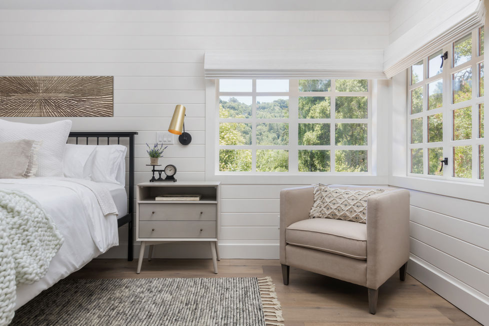 Modern farmhouse master suite remodel featuring new vaulted ceilings, designer furnishings, and a dreamy master bathroom retreat complete with a steam shower.